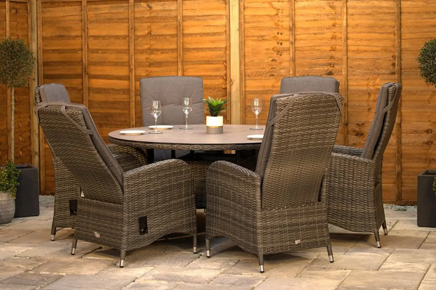 Burbage 6 Seater Round Reclining Dining Set in Stone Grey Rattan