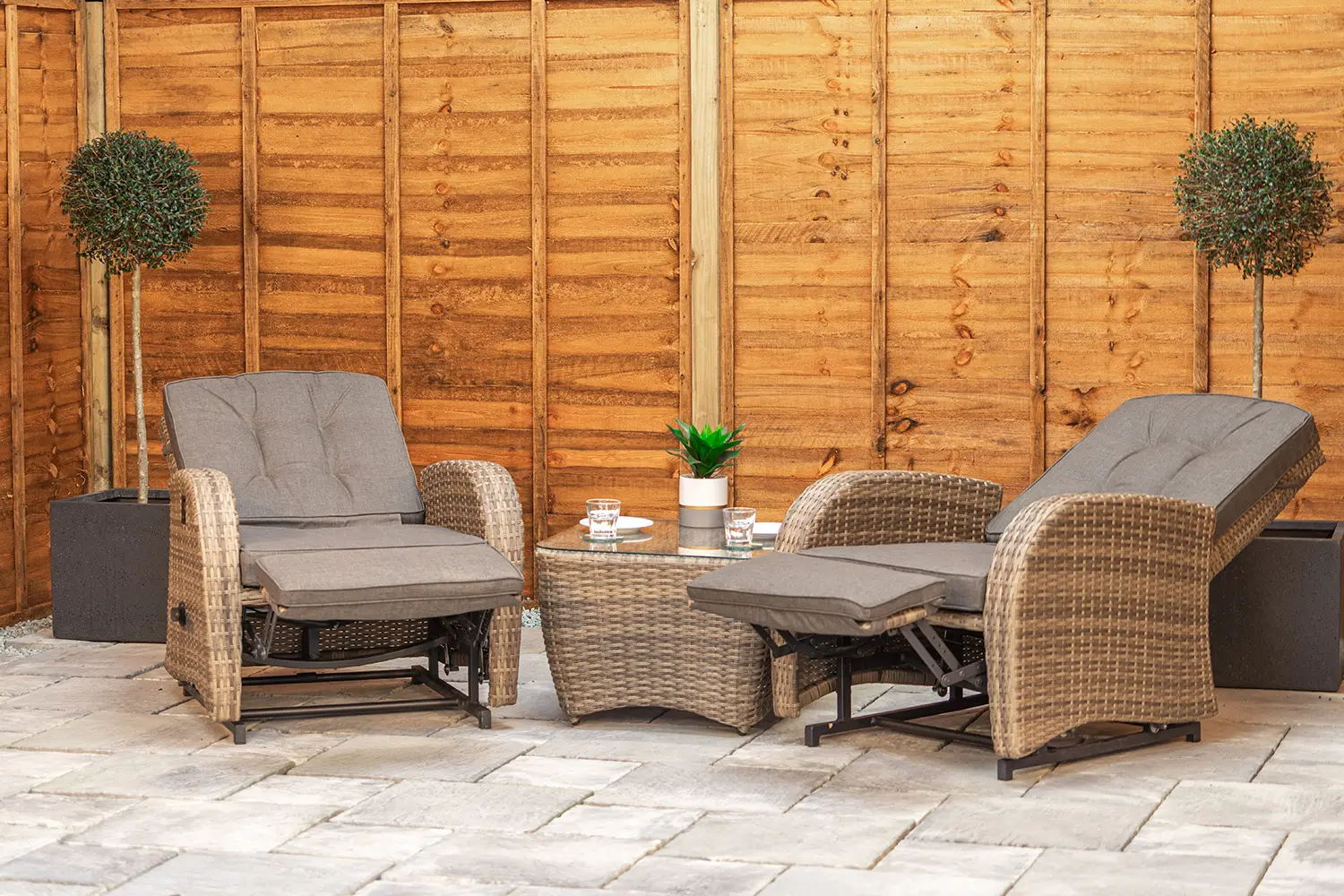 This bistro set comes with 2 rocking reclining armchairs with built in footrests. You also receive a 60cm square safety glass topped side table.