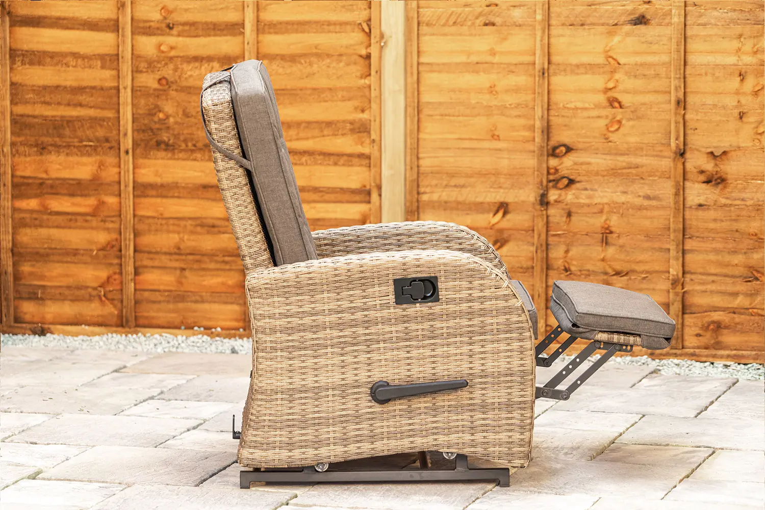 Enjoy a relaxing afternoon in the sun, with our luxurious latte rattan reclining bistro set. The extra thick cushions and easy to adjust reclining mechanism, allows you to find that perfect angle for drifting into a relaxing snooze.