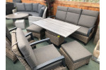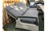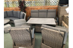 The set comes complete with two reclining rattan arm chairs, a 3 seater reclining sofa, two footstools, and a stone topped adjustable table. All cushions come with the set.