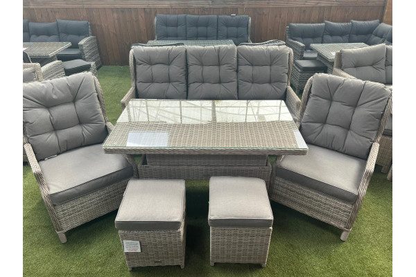 Recline and Relax! This summer you'll be in complete comfort on this great sofa set as each armchair and both side of the sofa recline, providing you and guests a great lounging experience. In total, four of the seats on this set recline, coupled with a Height Adjustable Table you're free to dine and socialise with great ease and comfort with 9cm Thick Cushions.