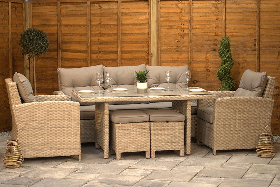 Apart of our popular Sapcote rattan furniture range, the Modular Lounge Set offers you the perfect blend between lounging and dining. Made up of comfortable chairs, a large dining table and handy footstools, this set is great for al fresco dining and also for outdoor lounging. Stylish as it is brilliant, the natural rattan has been very popular with our customers and continues to be the perfect addition to most gardens!