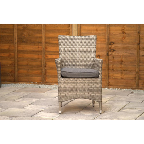 This stylish, light grey rattan will make a perfect addition to your garden, patio, or balcony. With the cushions included with this dining set, you can comfortably sit outside this summer.