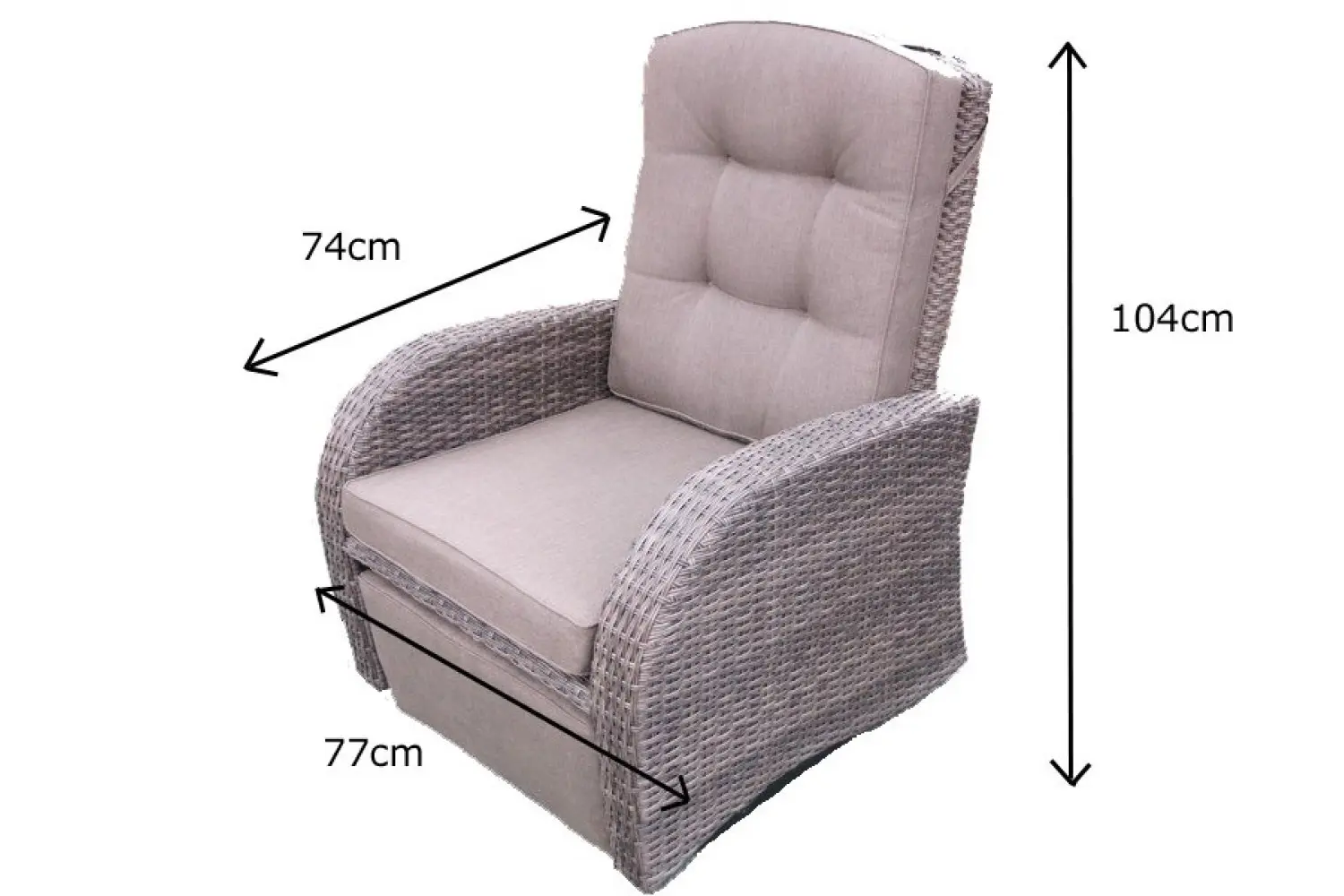 | Chair Features | Reclining back rest, rocking motion (can be stopped), arm chair, cushions included. |